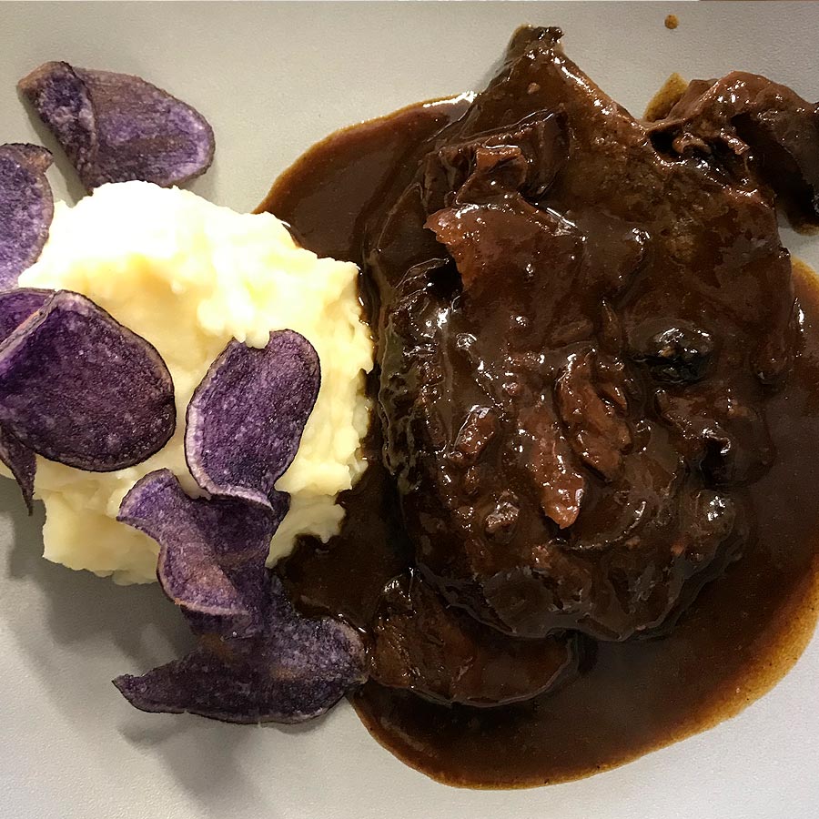 /Braised beef with mashed potatoes and beet chips