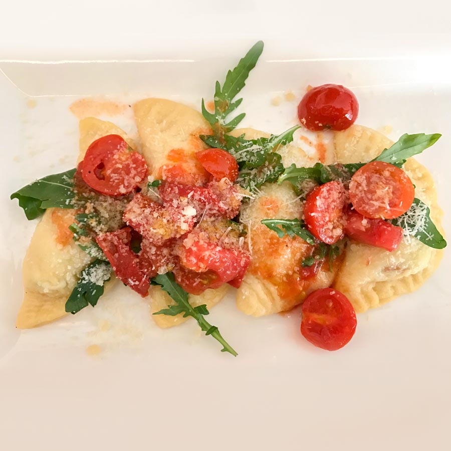/Ravioli with ricotta cheese, tomatoes and rocket salad