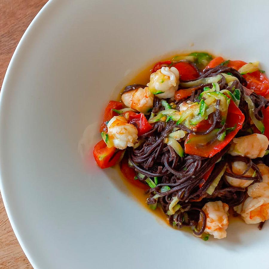 /Chocolate tagliolini pasta with fresh tomatoes, zucchini and shrimps