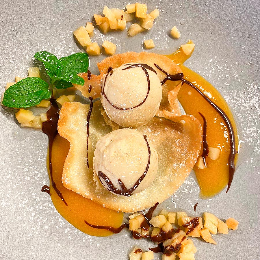 /Homemade hip with coffee ice cream, apricot and quince